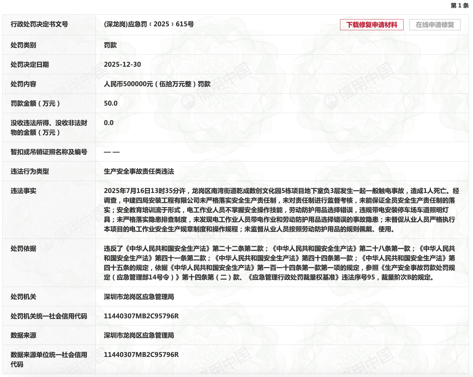 信誉我国网站显现,近来,中建四局装置工程有限公司因出产安全事端职责类违法,被深圳市龙岗区应急管理局罚款50万元。违法现实显现,2025年7月16日13时35分许,龙岗区南湾大街乾成数创文化园5栋项目地下室负3层产生一同一般触电事端,形成1人逝世。