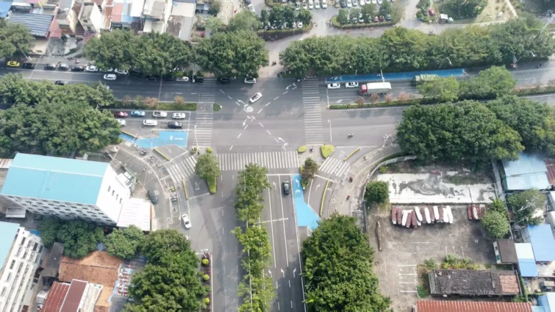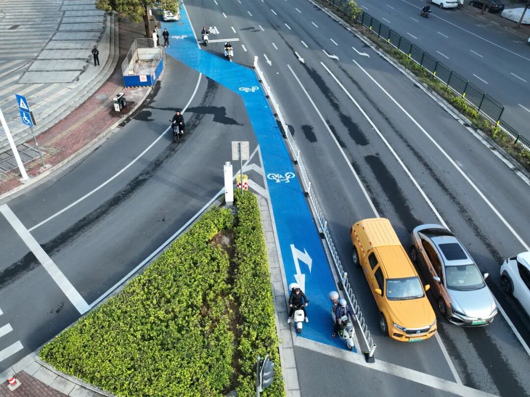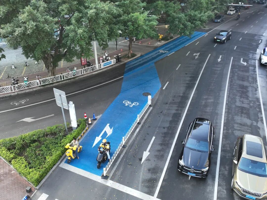 新增地上五颜六色沥青、完善相关标志标线,施划非机动车一次性过街导流线及相应路面标识,为机动车与非机动车分流通行供给明晰指引;